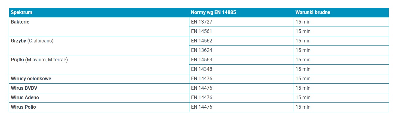 Działa w 15 min na bakterie, grzyby, prątki gruźlicy, wirusy osłonkowe (m.in. Vaccinia, BVDV), Adeno, Polio