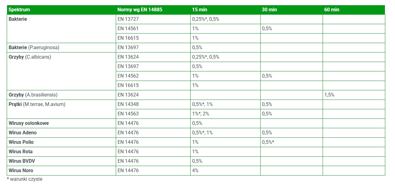 Działa na bakterie, grzyby, prątki gruźlicy, wirusy osłonkowe (m.in. Vaccinia, BVDV) oraz nieosłonkowe – Adeno, Polio, Rota, Noro