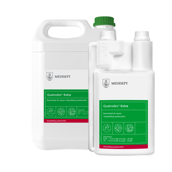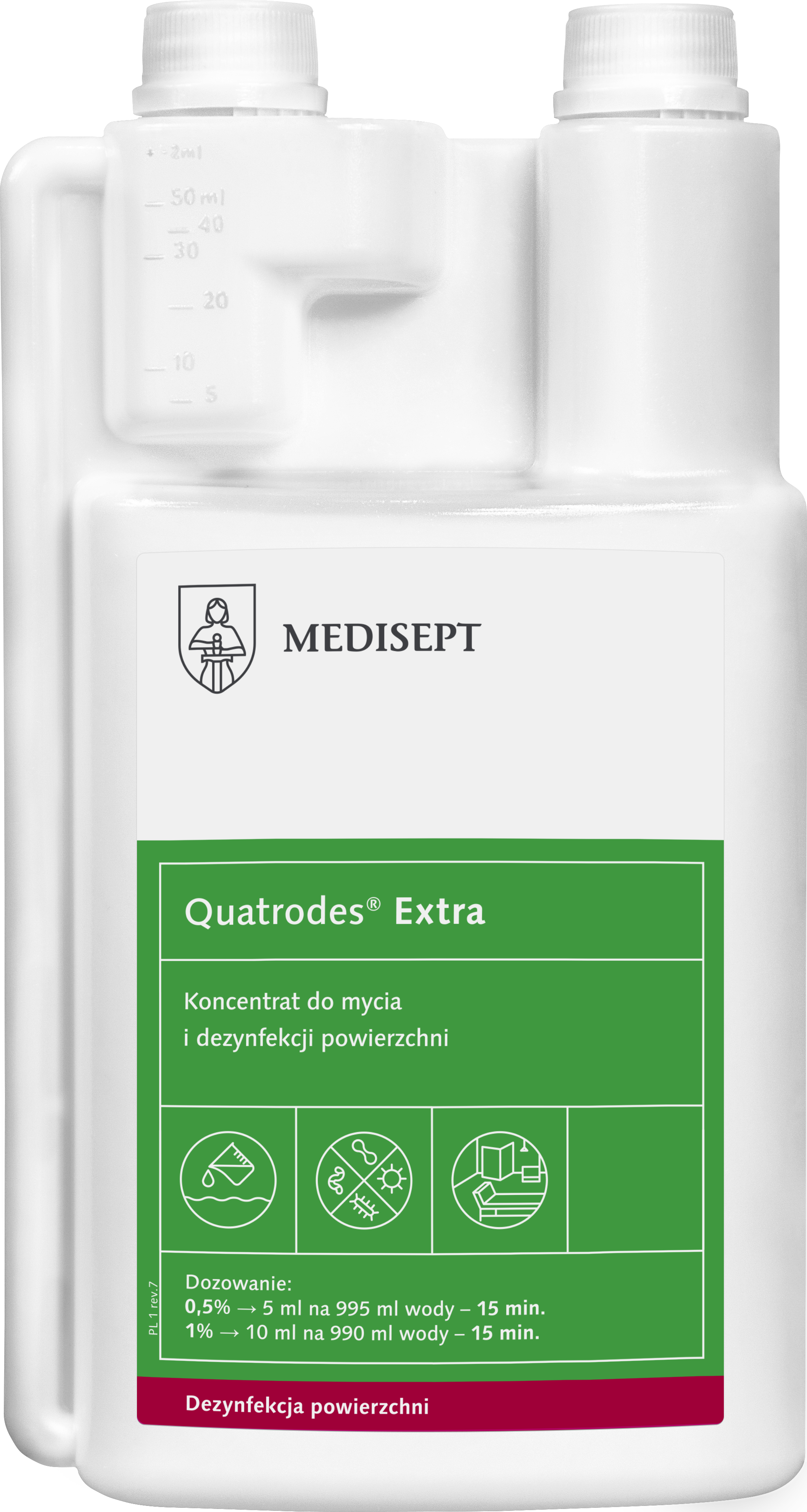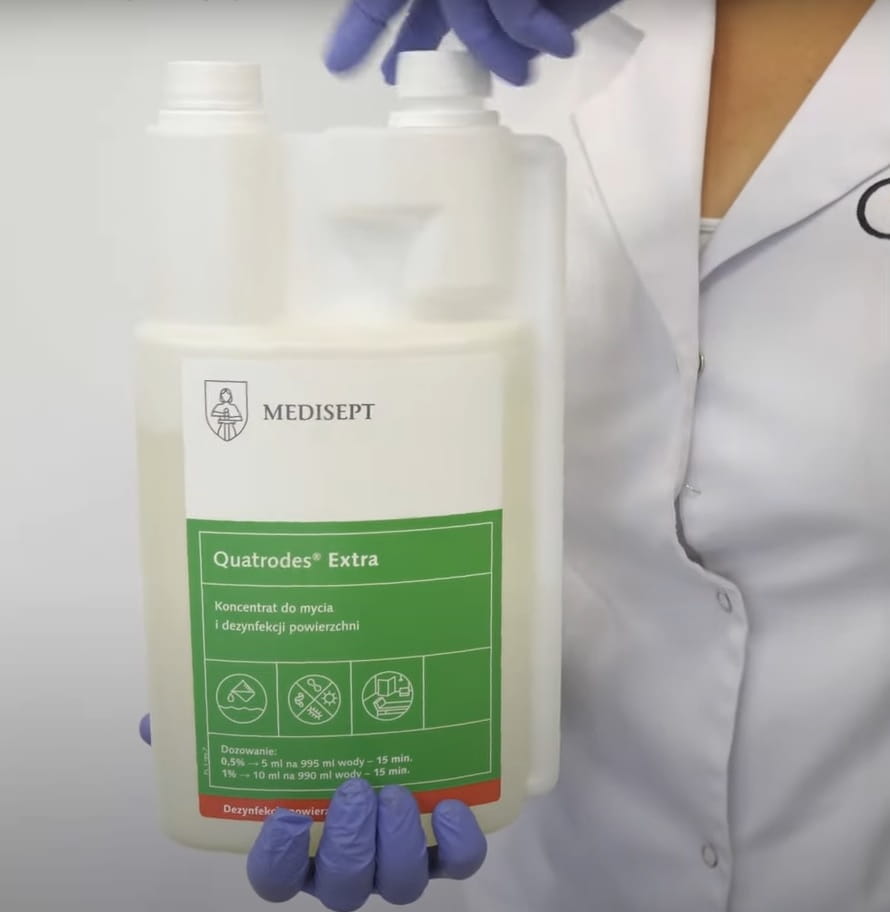 Quatrodes Extra to płynny koncentrat do jednoczesnego mycia i dezynfekcji powierzchni w obszarze medycznym (unity, łóżka i fotele zabiegowe, stoły operacyjne, aparatura medyczna) – jakow wyrób medyczny.