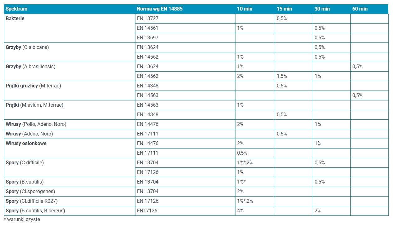 Mycie i dezynfekcja powierzchni (w zależności od wybranego stężenia): powierzchnie sprzętu medycznego spryskać roztworem 1% lub przetrzeć ściereczką i pozostawić do działania na 10 min. Produkt pozostawia biały osad na dezynfekowanej powierzchni dlatego zaleca się po dezynfekcji przetarcie pozostałości jednorazowym ręcznikiem