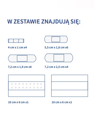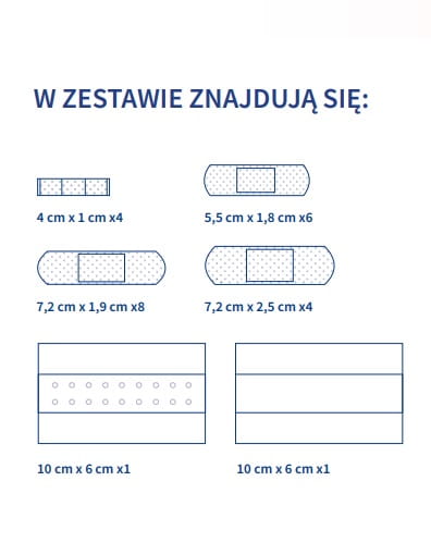 - różnorodne kształty plastrów w zestawie umożliwiają zachowanie kompleksowej ochrony powierzchownych skaleczeń, otarć, przecięć na skórze